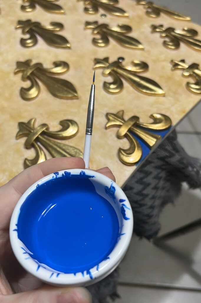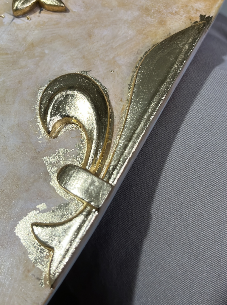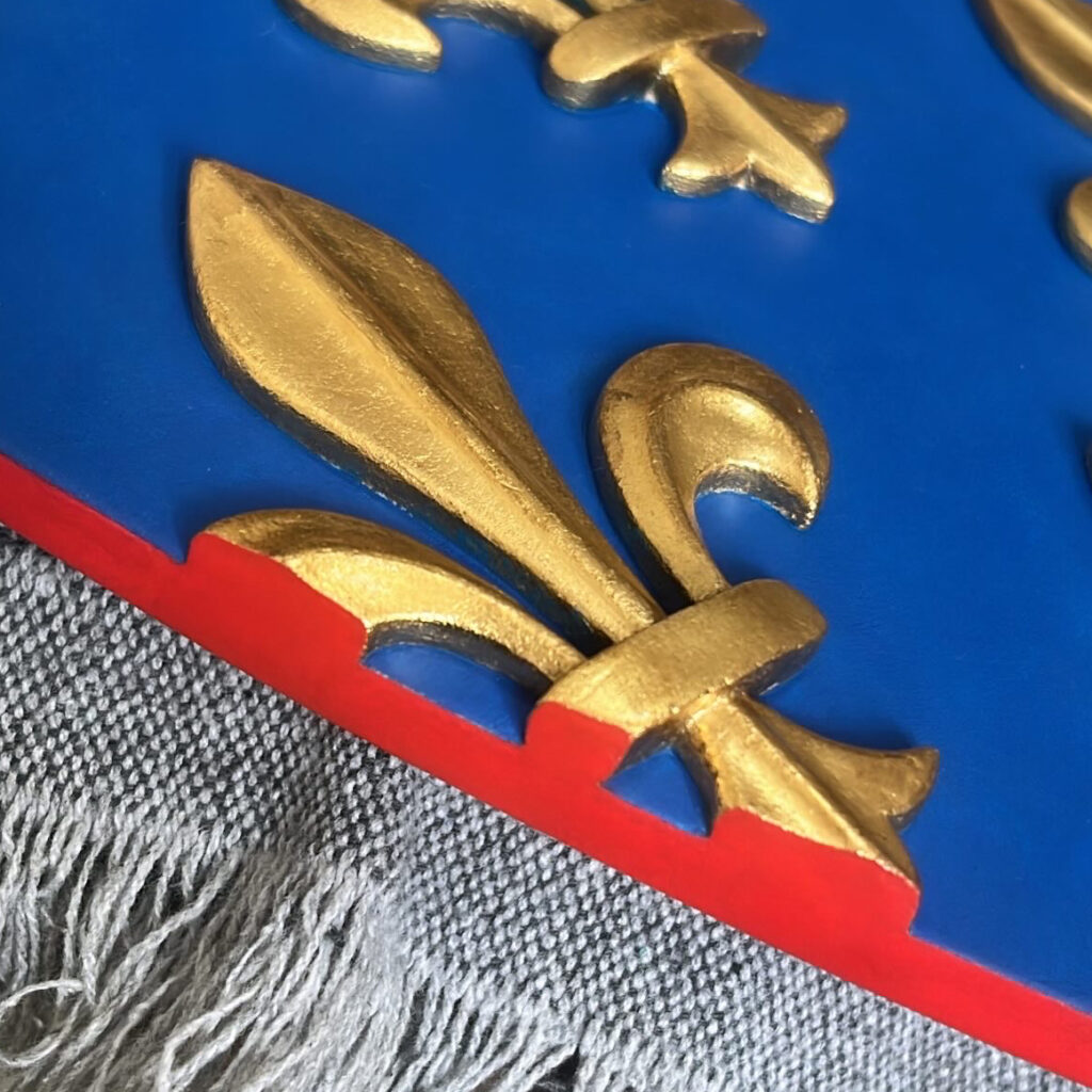 Então, cada flor recebeu uma camada de verniz mordente, foi revestida com folha de ouro imitação e, em seguida, coberta com verniz brilhante para proteção. O excesso de ouro aderido à superfície do escudo foi cuidadosamente raspado com um canivete fino. Por fim, com a aplicação das tintas, o brasão chegou à sua forma completa e reconhecível.