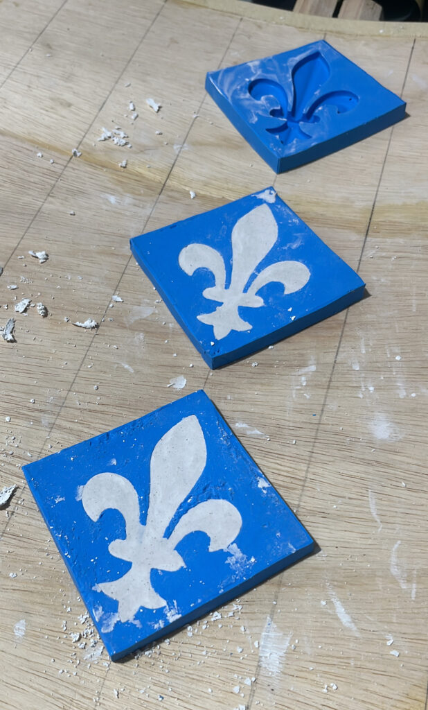 Os moldes de silicone foram posicionados no verso de outro escudo com as mesmas dimensões, de modo que as flores adquirissem a curvatura correspondente às posições que ocupariam. O encaixe não foi perfeito, mas foi suficiente para o propósito. Cada cópia levou cerca de três dias para secar completamente.