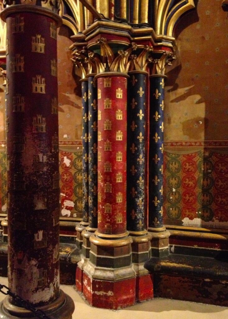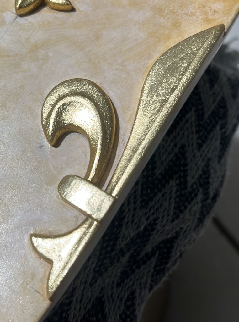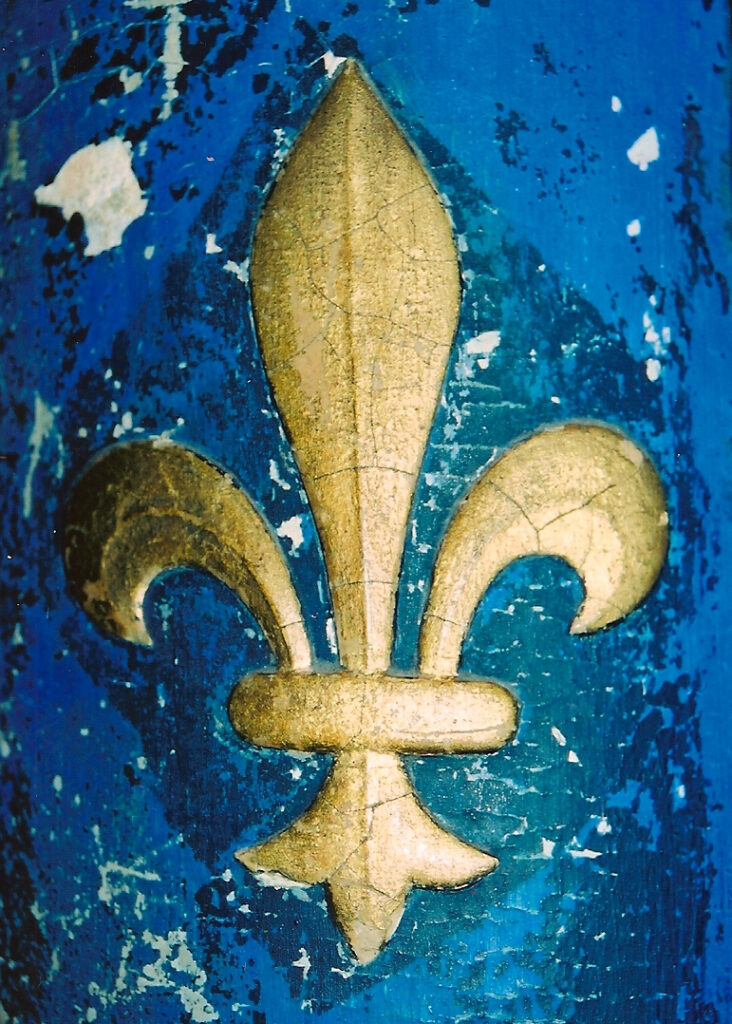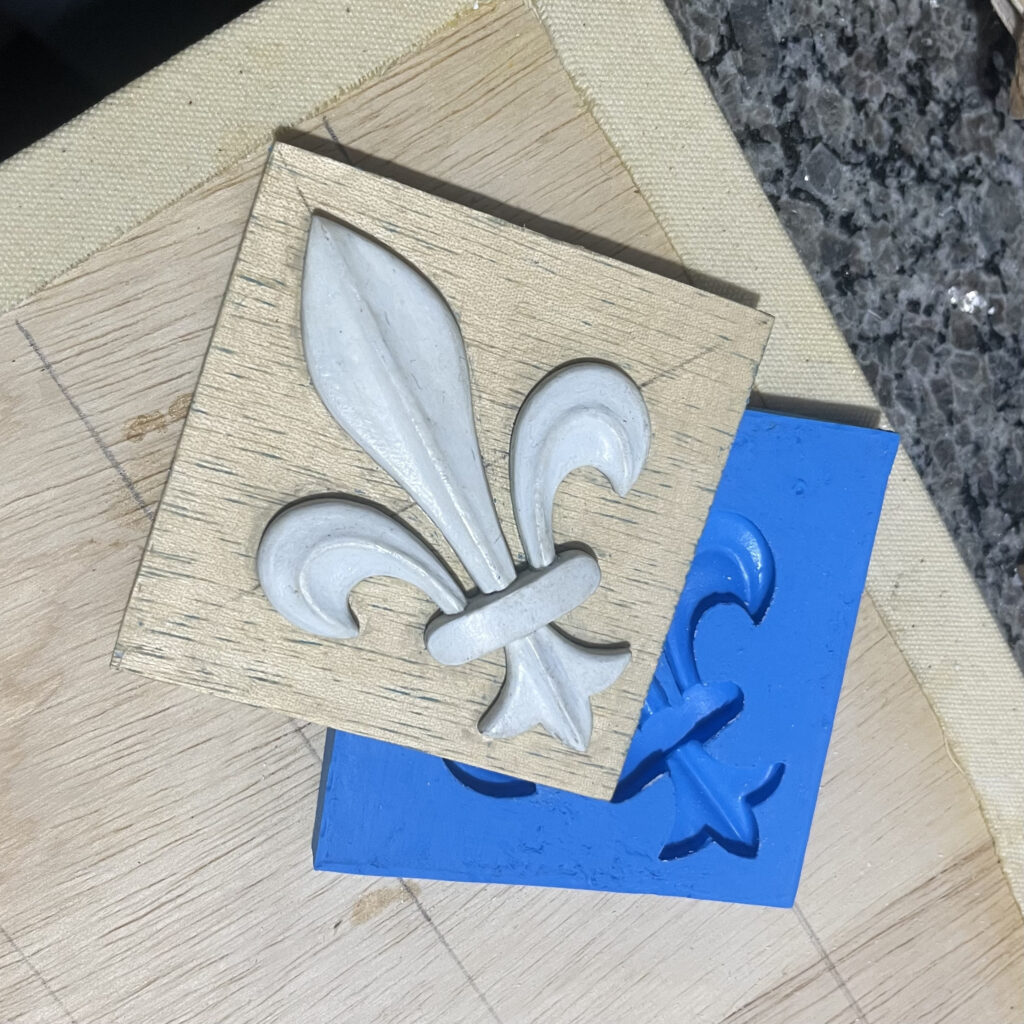 A flor-de-lis foi reproduzida segundo o contexto histórico, tomando como referência as que adornam os pilares da Sainte-Chapelle, em Paris. Por se tratar de um elemento que se repete em todo o campo do brasão, uma primeira peça foi esculpida manualmente, a partir da qual foram confeccionados moldes de silicone, permitindo assim a produção de várias cópias.